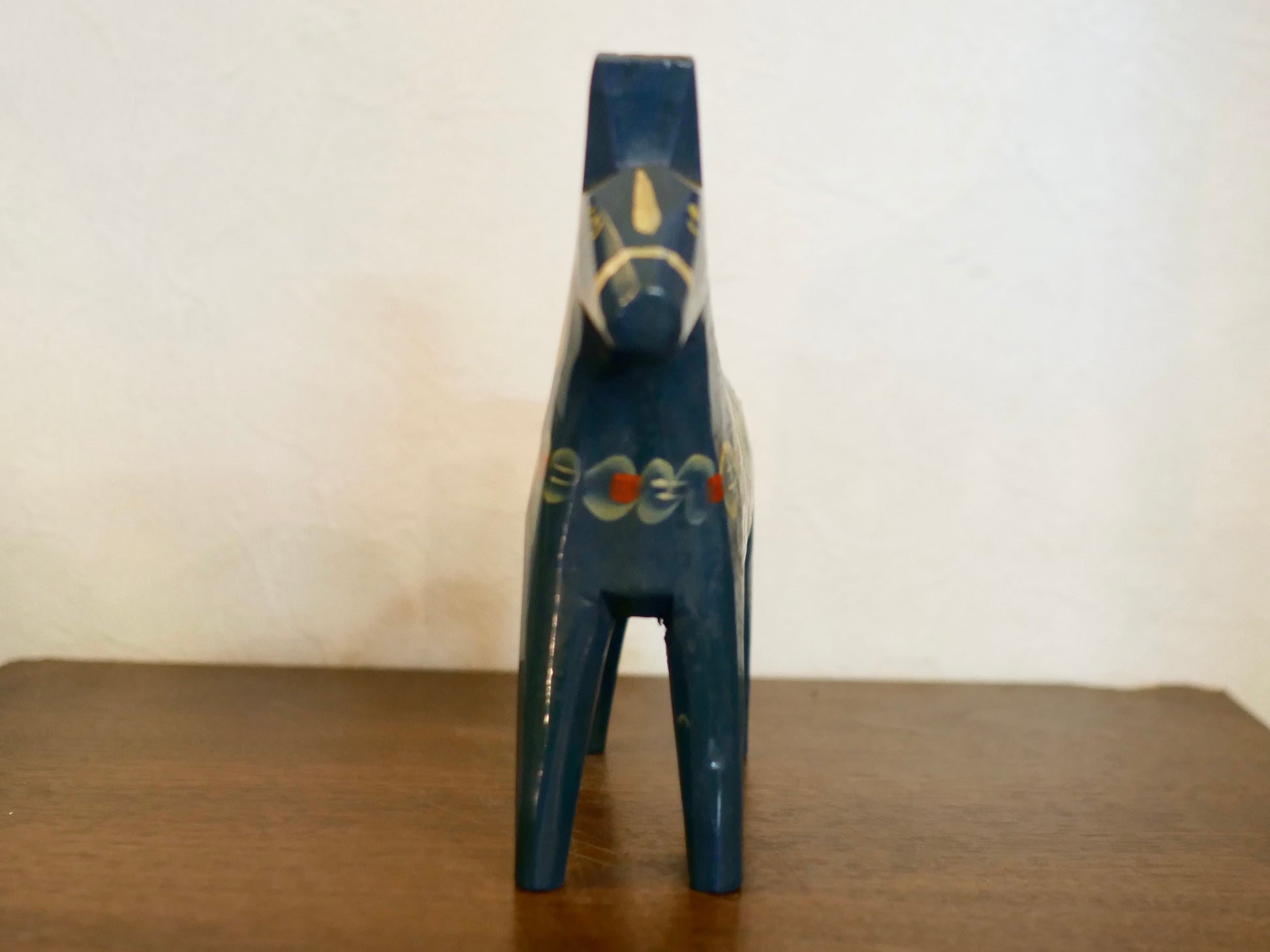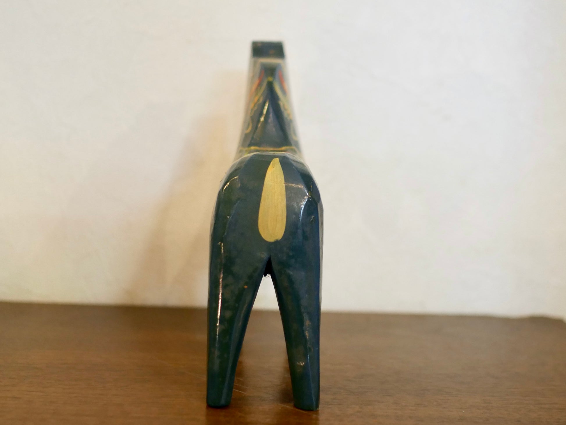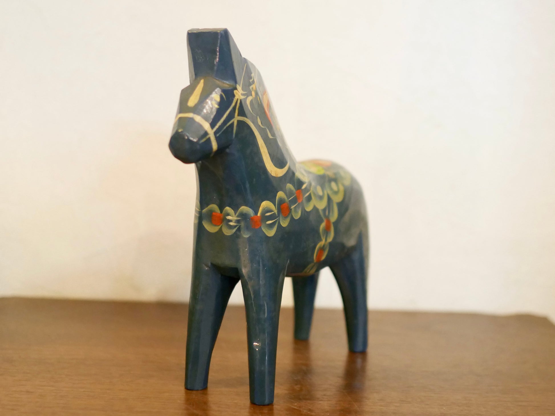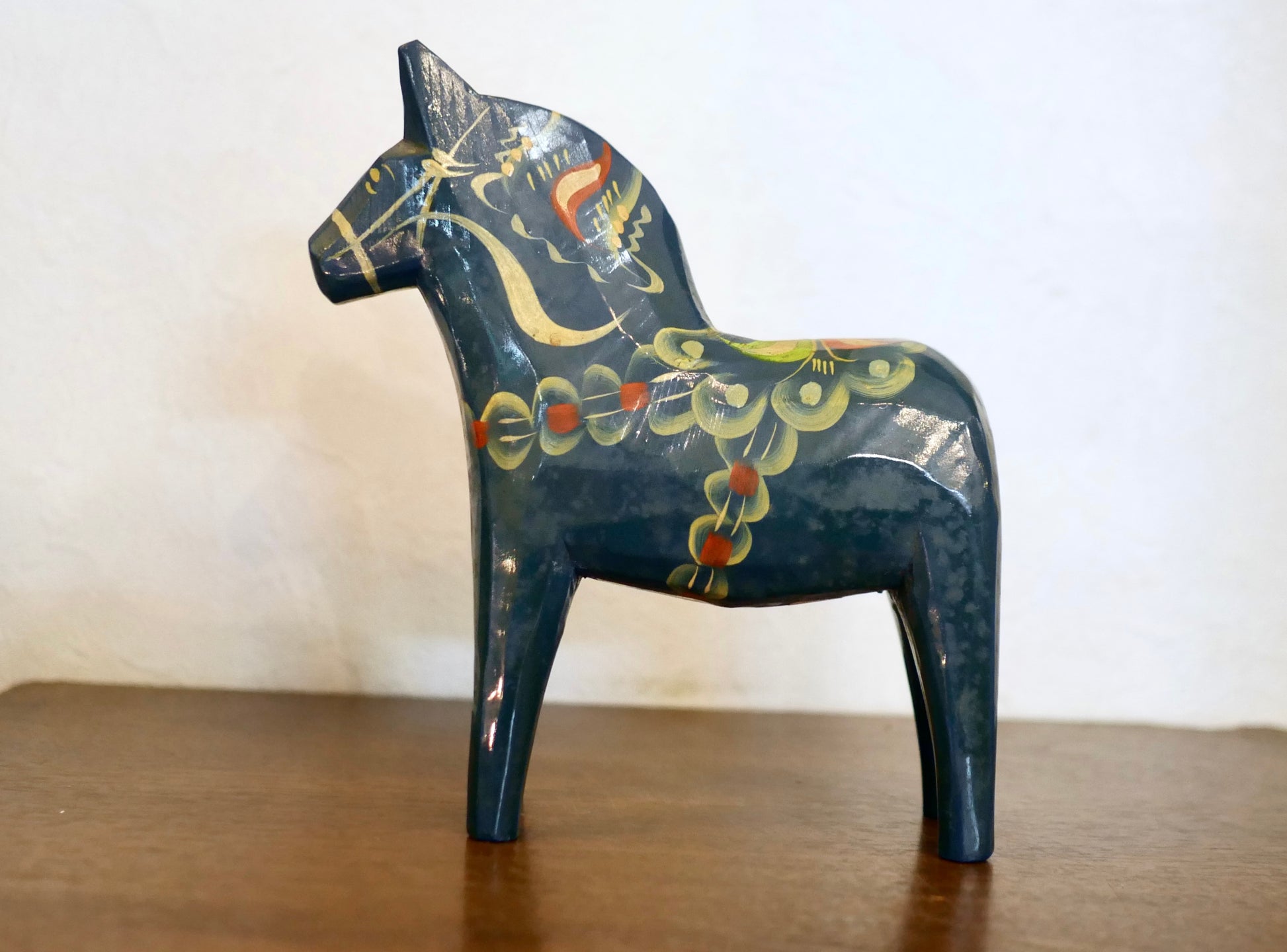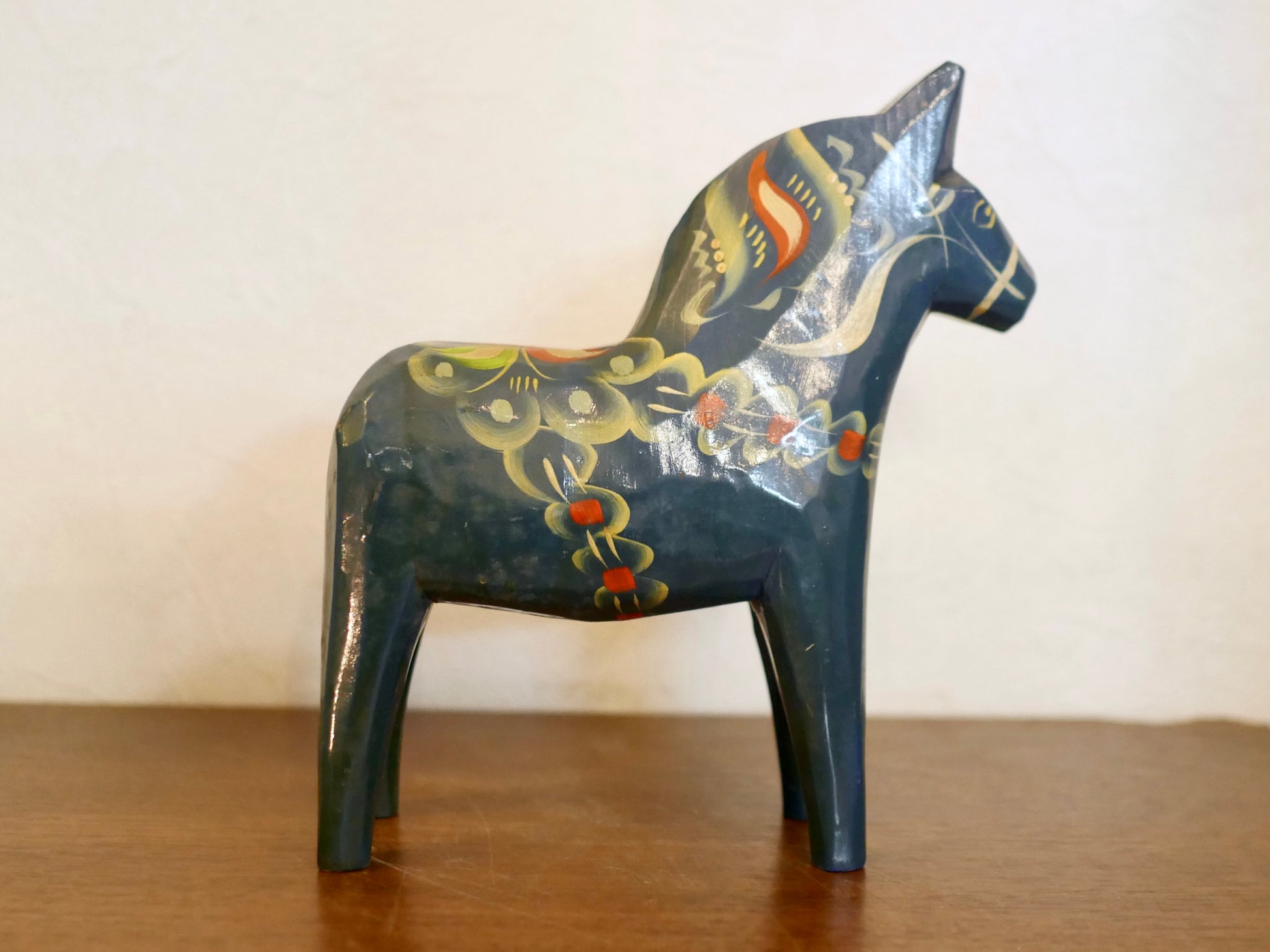 幸せを運ぶ馬。スウェーデンの主にダーラナ地方で19世紀より愛される伝統的な木製の馬の置物です。穏やかな深みのある緑色で、絵のタッチも柔らかく哀愁が漂います。