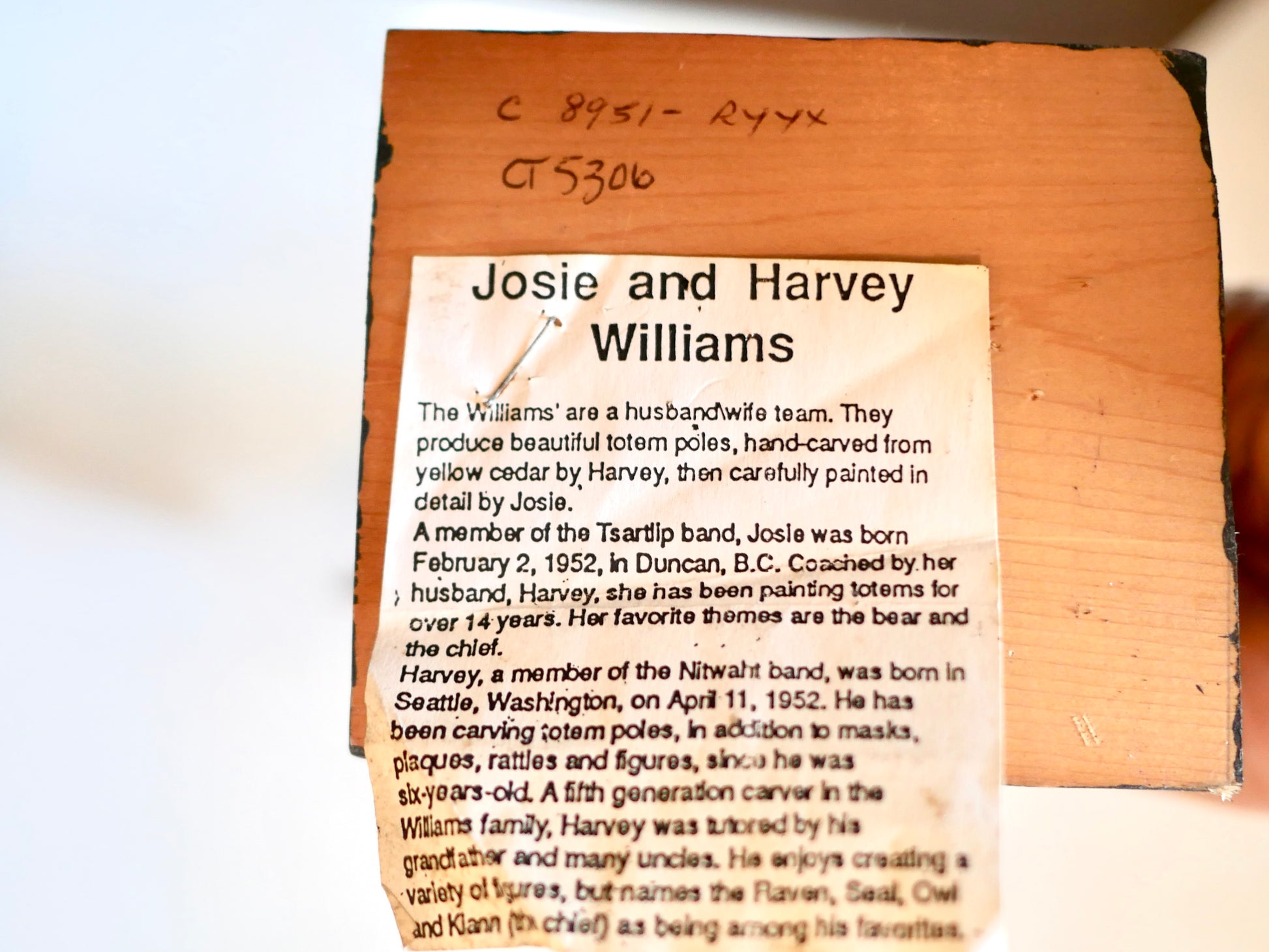 この羽を広げて聳え立つトーテムポールは、ウィリアムズ夫妻によって制作されたものです。妻のジョシーはカナダ/ブリティッシュコロンビア州のTsartip bandの一員に生まれ、夫のハーヴェイはアメリカ/ワシントン州のNitwaht bandの中で幼い頃から仮面・置物・トーテムポールを作っていたそうです。