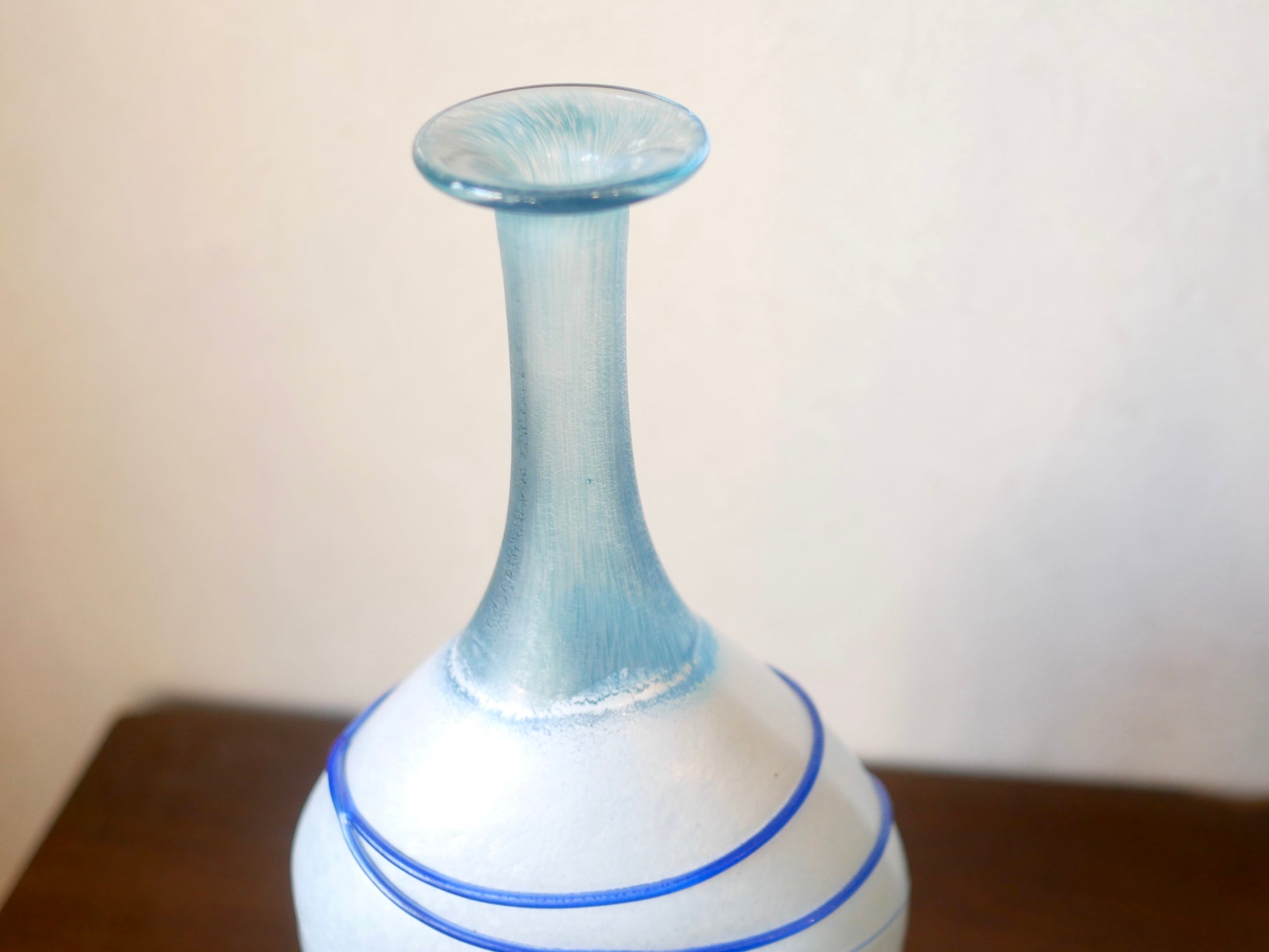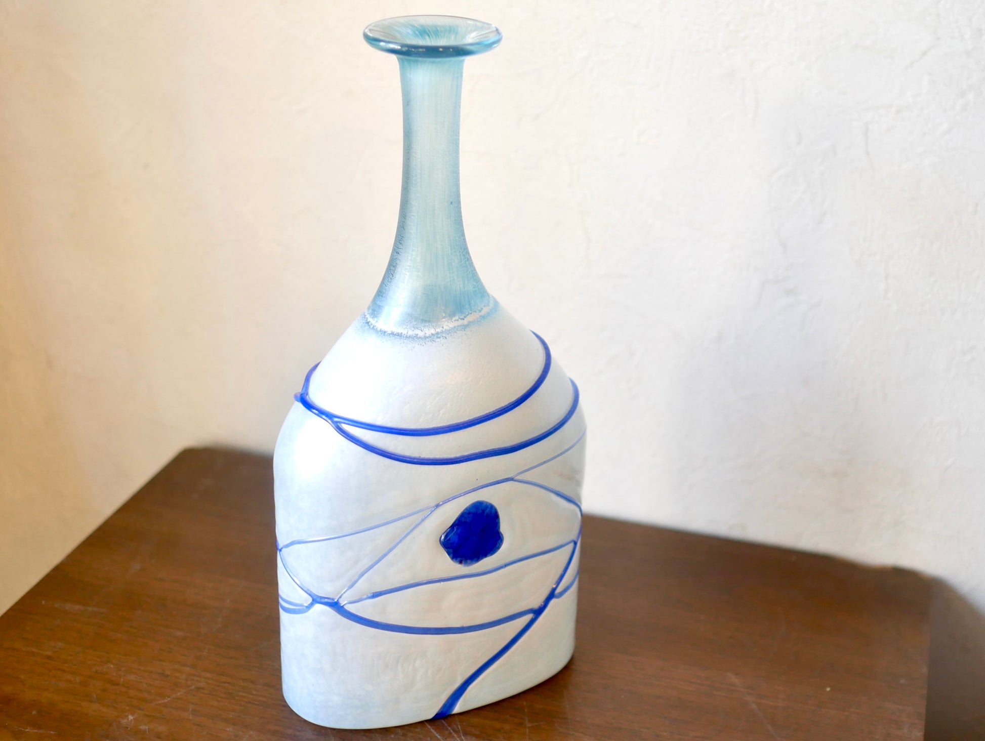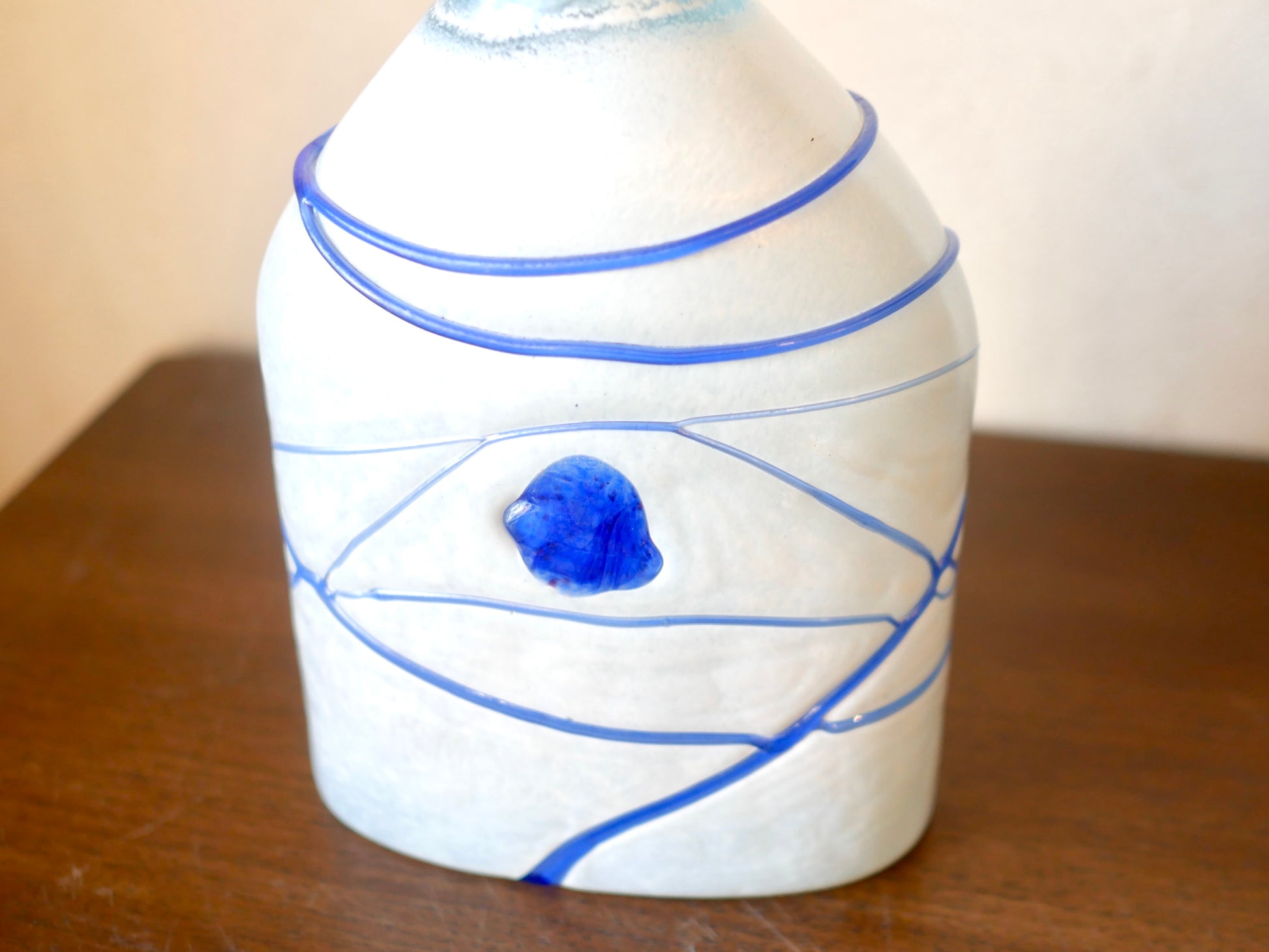 白い星屑を散りばめた様な地に青で描かれた宇宙の神秘を思わせる様な大胆な模様。口から首部分の半透明のガラスには細かな水色の斑模様が美しく、胴部分とのコントラストが美しく際立つ逸品です。